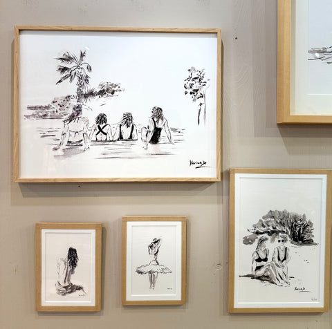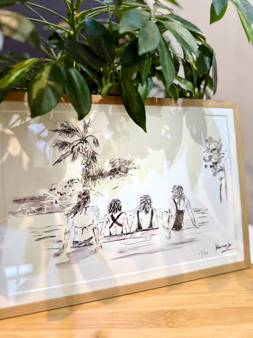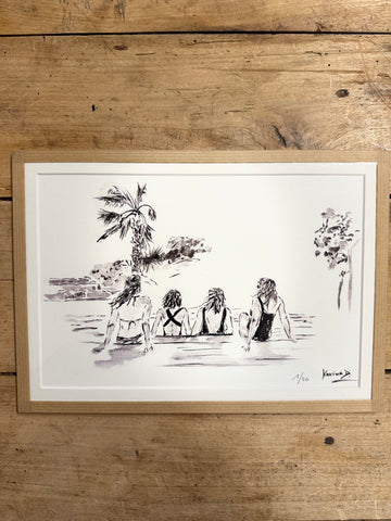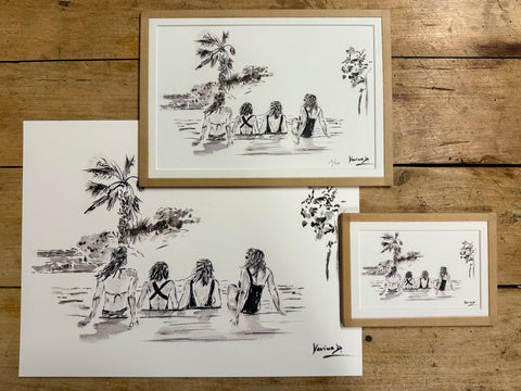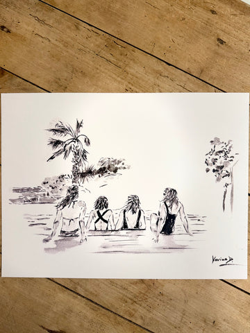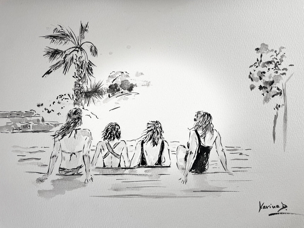 Aquarelle. 4 femmes au bord de l'eau en maillots de bain. Noir et blanc.